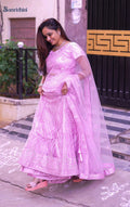 - Blouse: A matching Lavender Crop Blouse with short sleeves and a round neckline. It features subtle embroidery details on the neckline and bust, complementing the skirt's elegance.