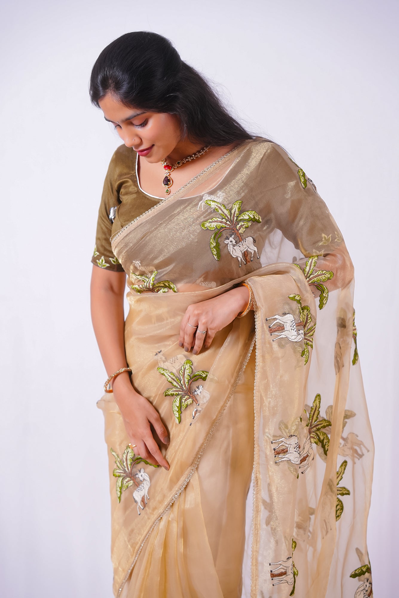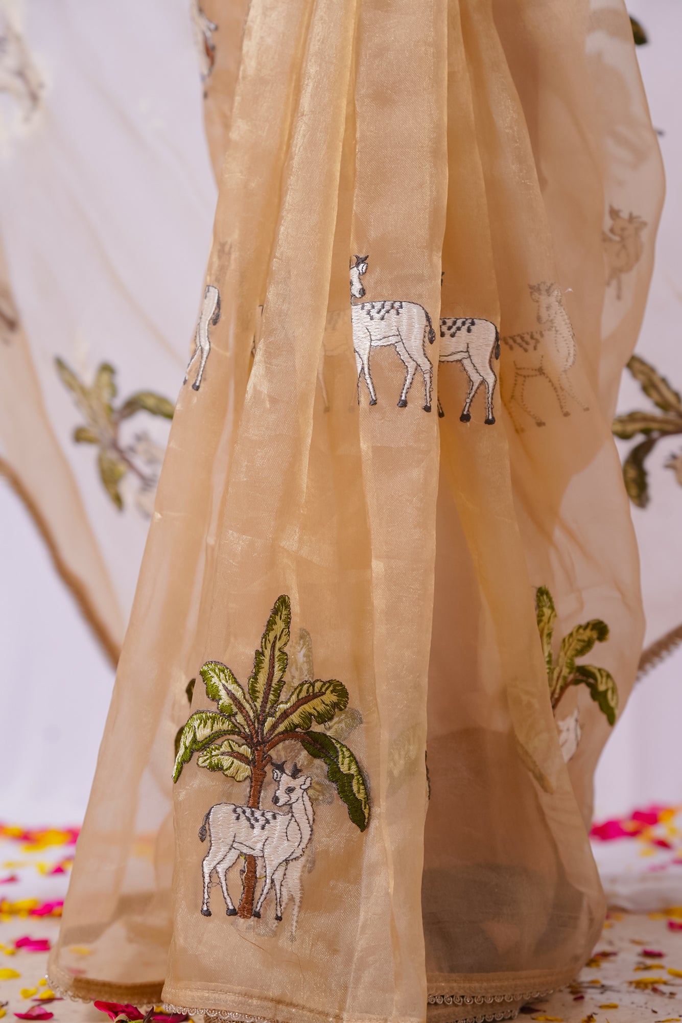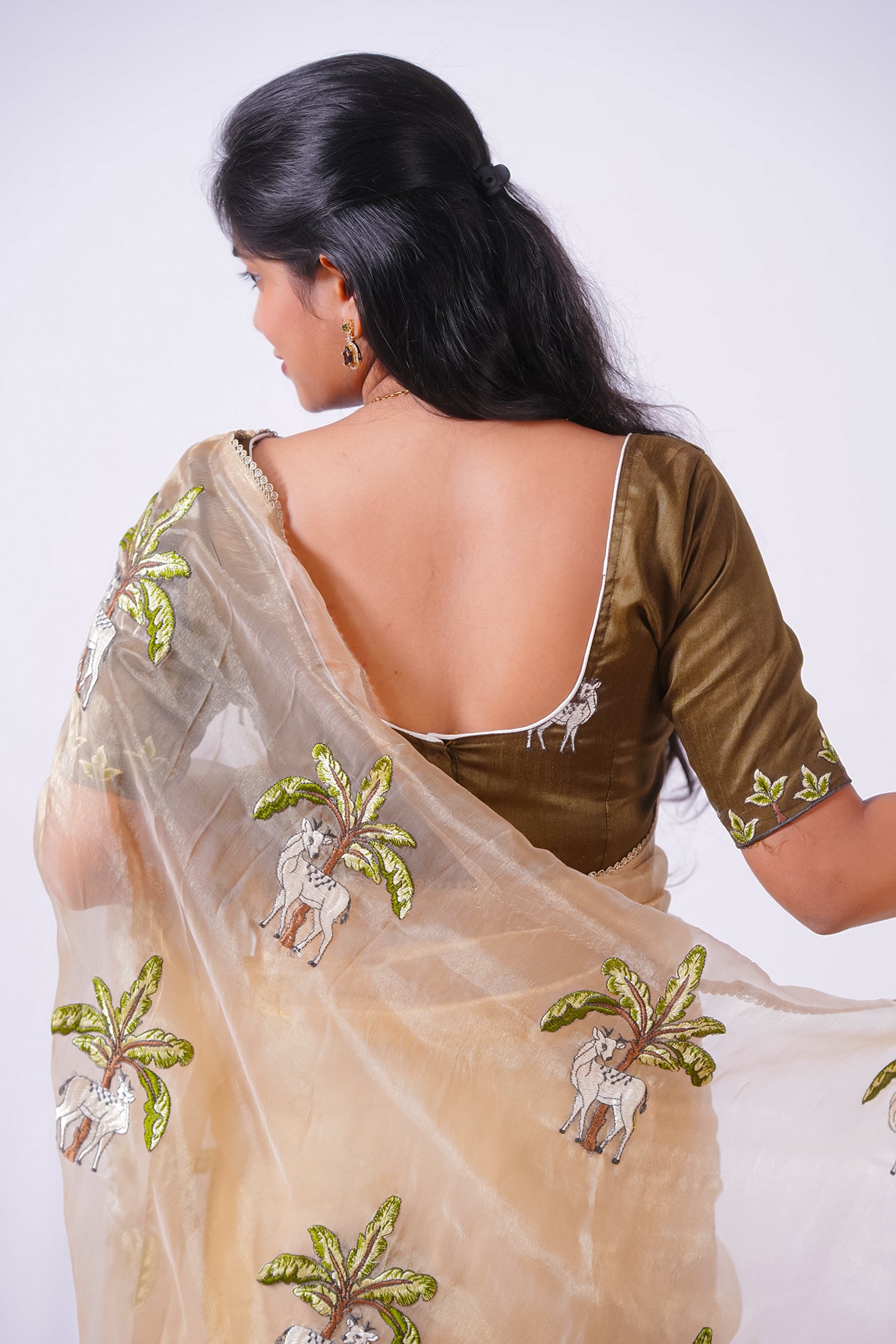 - Design: Features unique and intricate hand-embroidered motifs of sacred cattle (like a Kamdhenu or cow-calf figure) under stylized palm trees in shades of white, brown, and green, meticulously placed across the body and pallu of the saree.