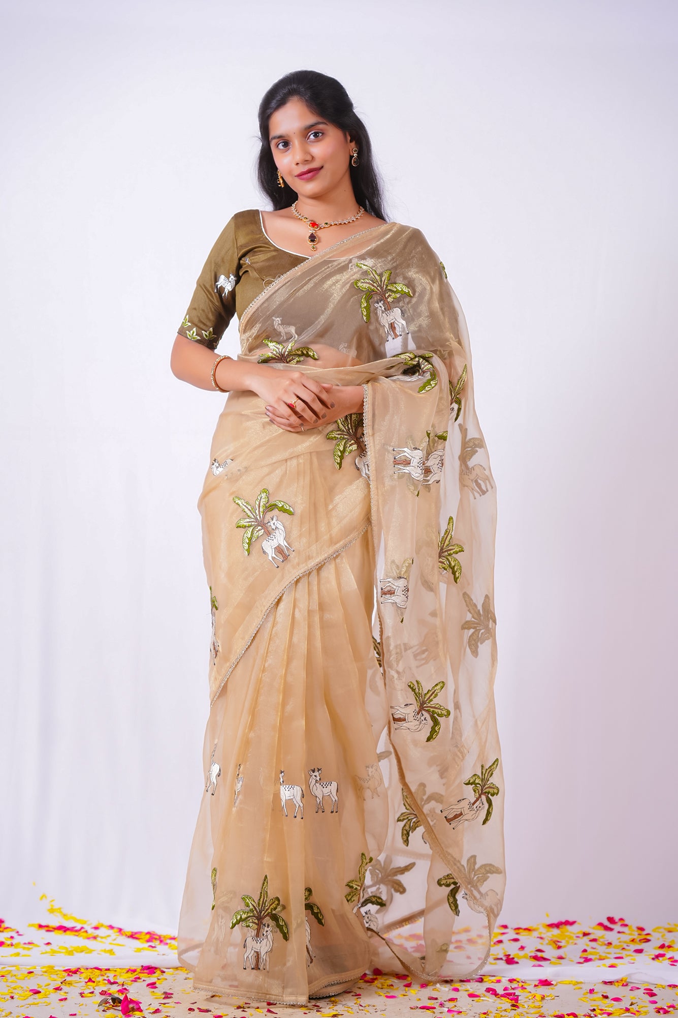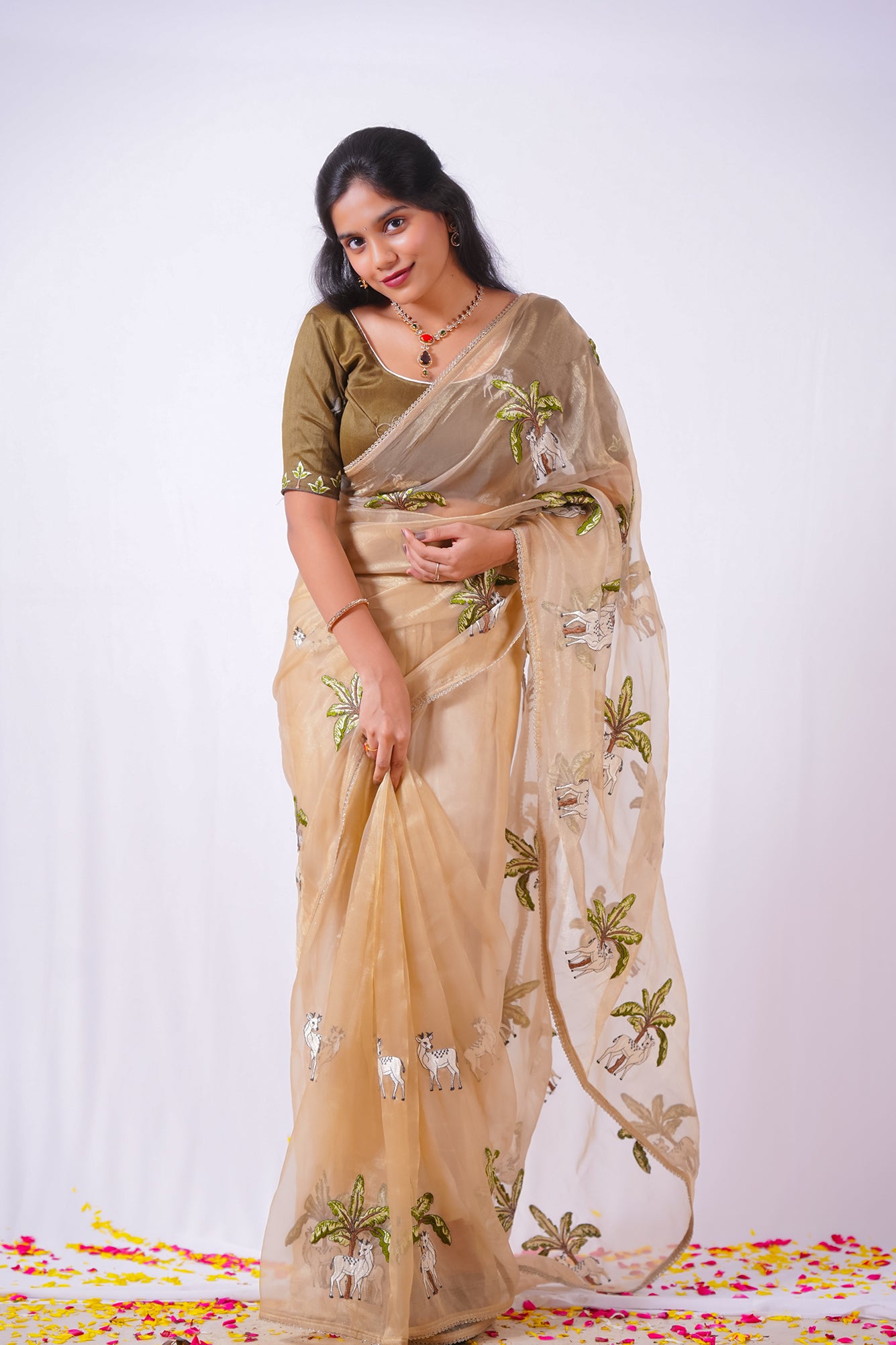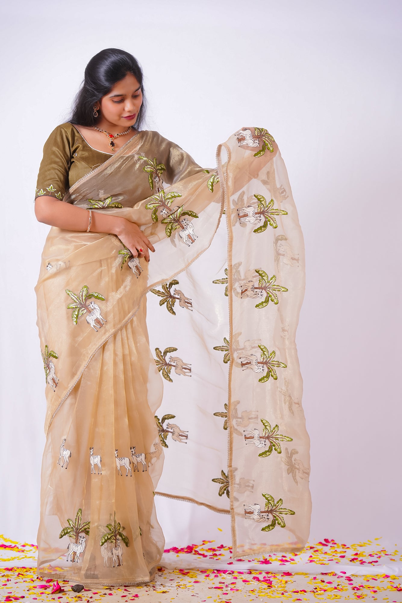 - Design: Features unique and intricate hand-embroidered motifs of sacred cattle (like a Kamdhenu or cow-calf figure) under stylized palm trees in shades of white, brown, and green, meticulously placed across the body and pallu of the saree.