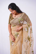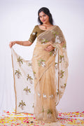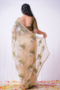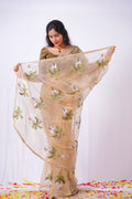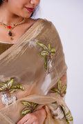 - Blouse: Olive Green (or deep khaki) blouse with a boat or scoop neckline and elbow-length sleeves. The sleeves and the back neckline feature minimal matching embroidery, complementing the saree's unique motif.