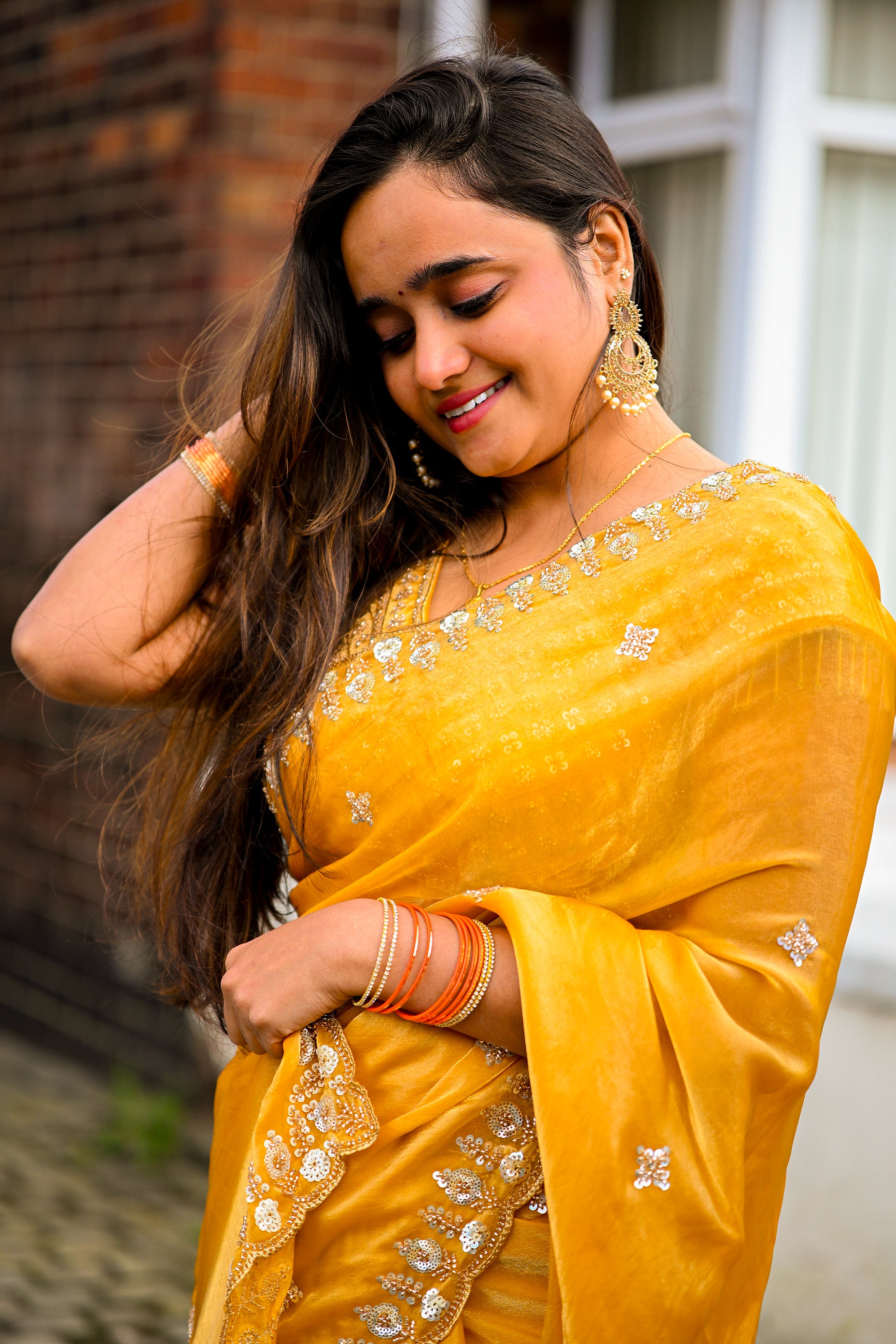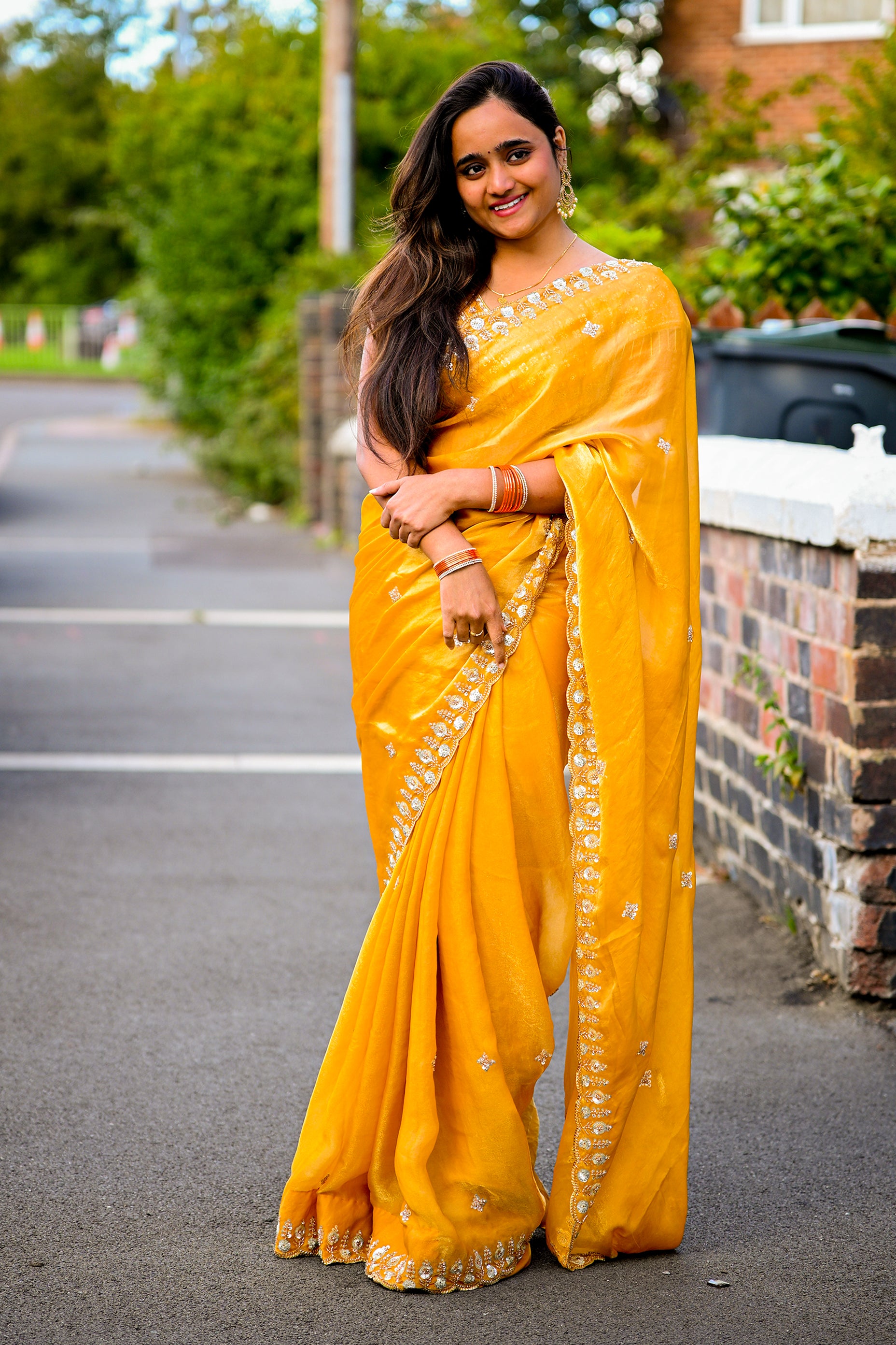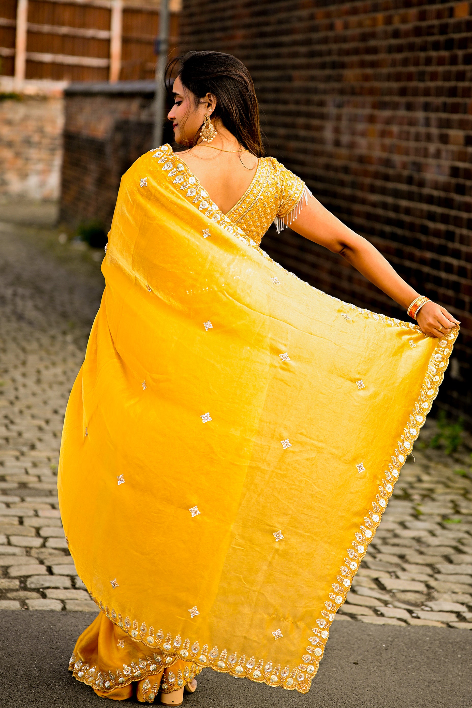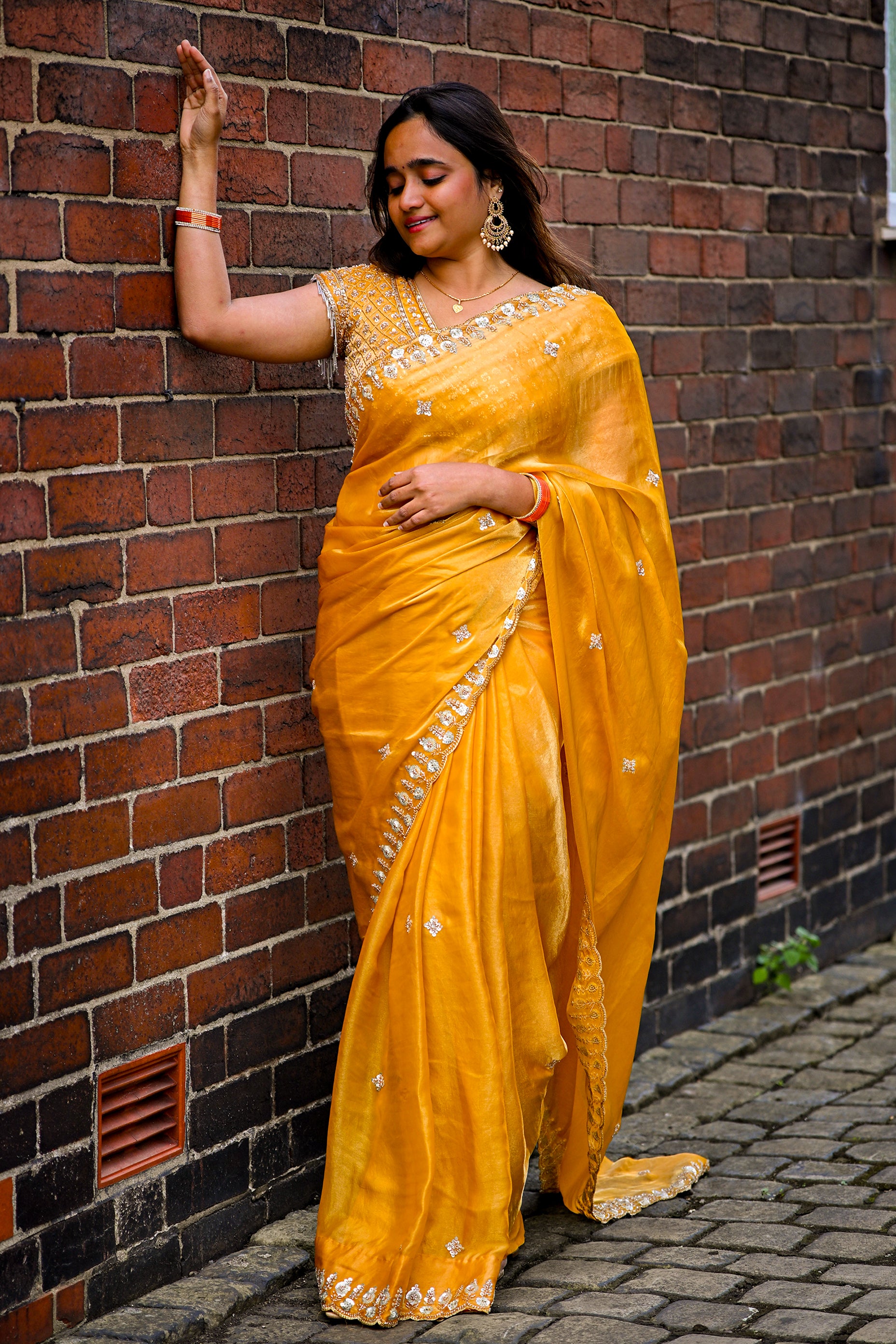 Blouse: Matching golden embroidered blouse with delicate bead tassels on the sleeves, enhancing the festive appeal