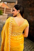 Border and Pallu: Detailed embroidered border embellished with sequins and threadwork, paired with a gracefully shimmering pallu