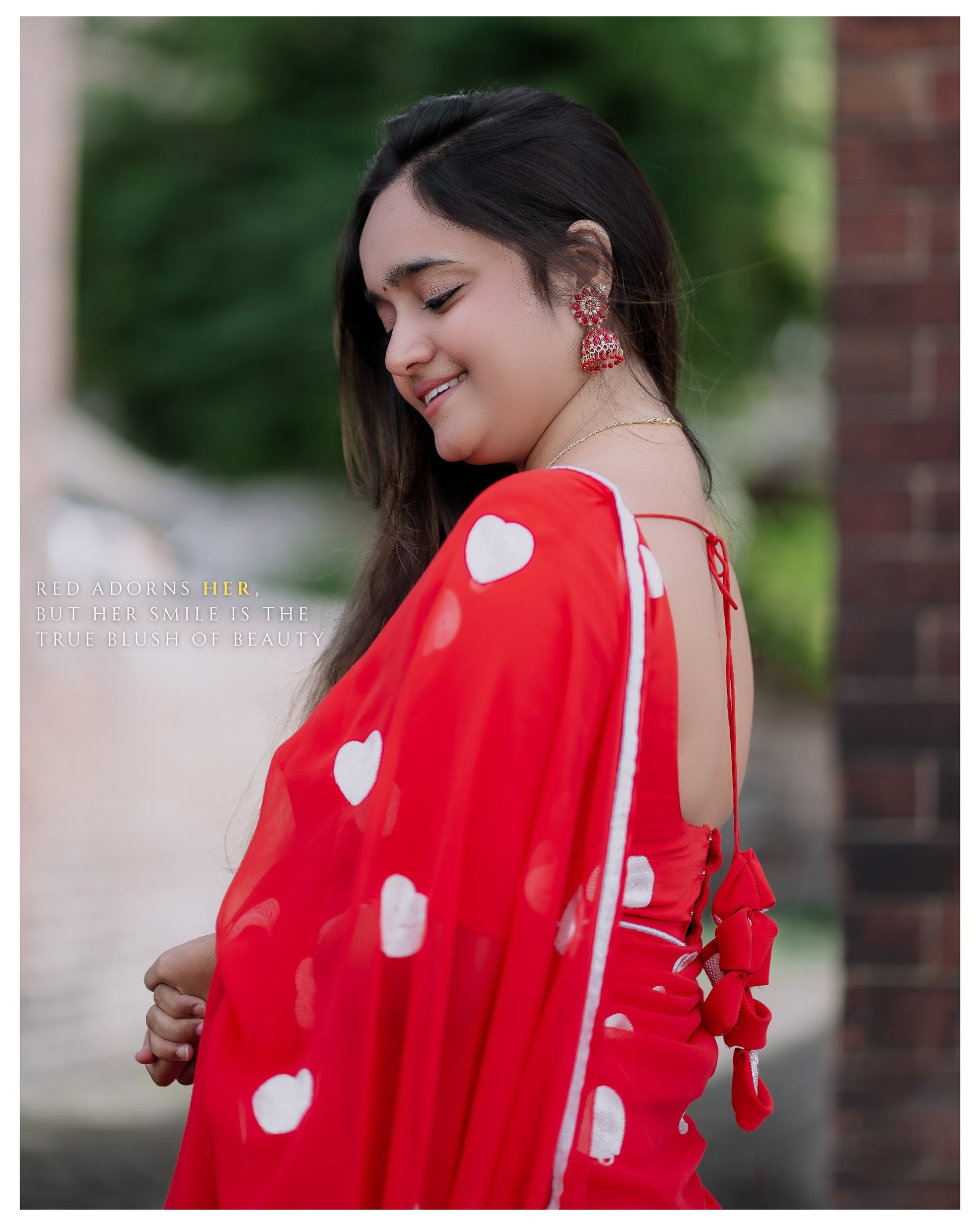 Blouse: Matching red blouse with heart motifs and stylish tie-up bow design at the back, adding a trendy statement