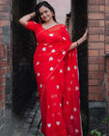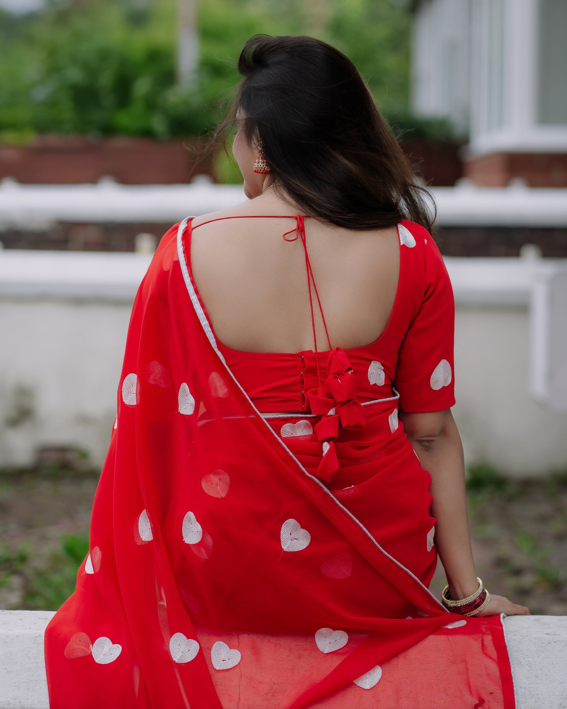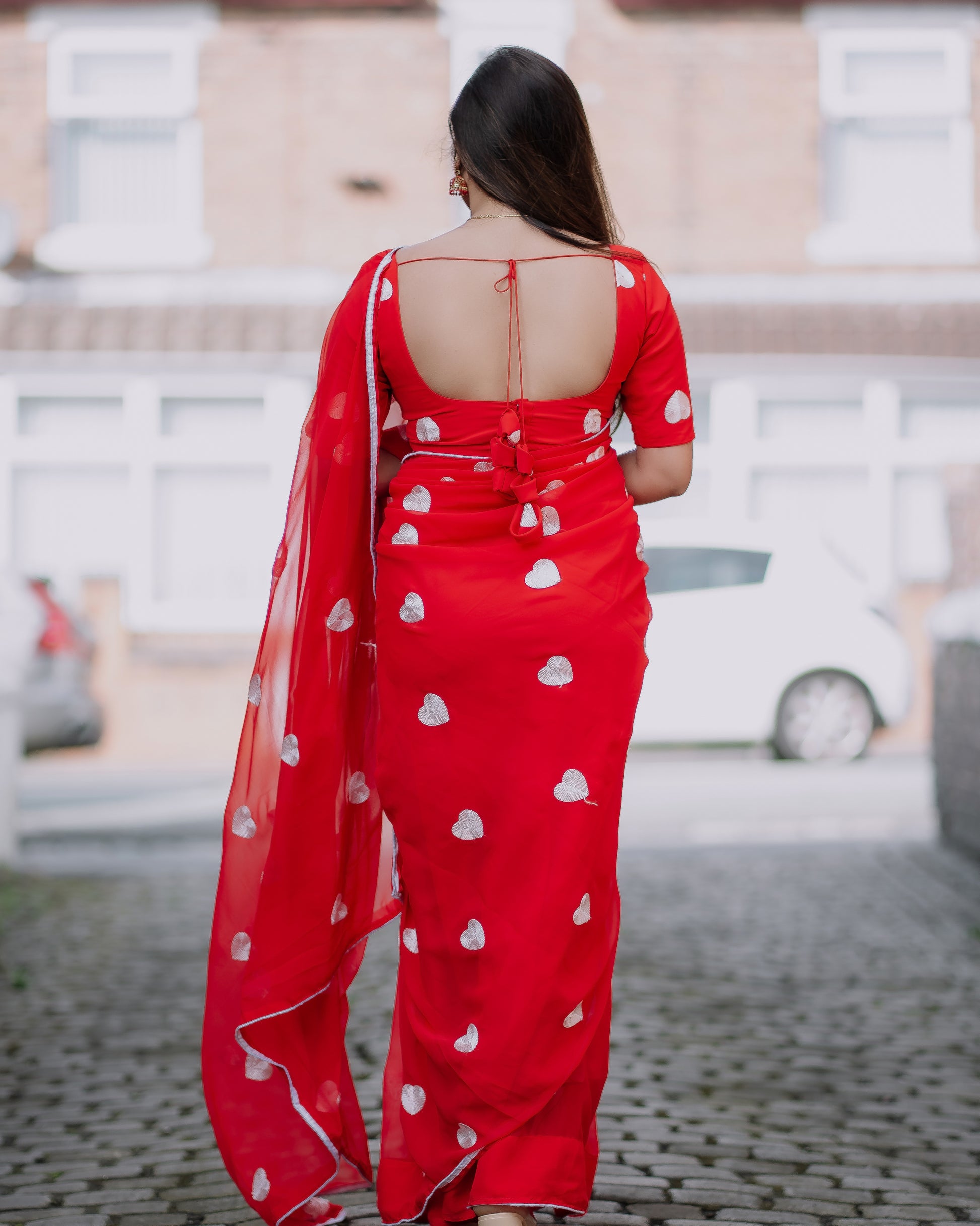 A Red Georgette Saree with embroidery White Heart Motifs❣️