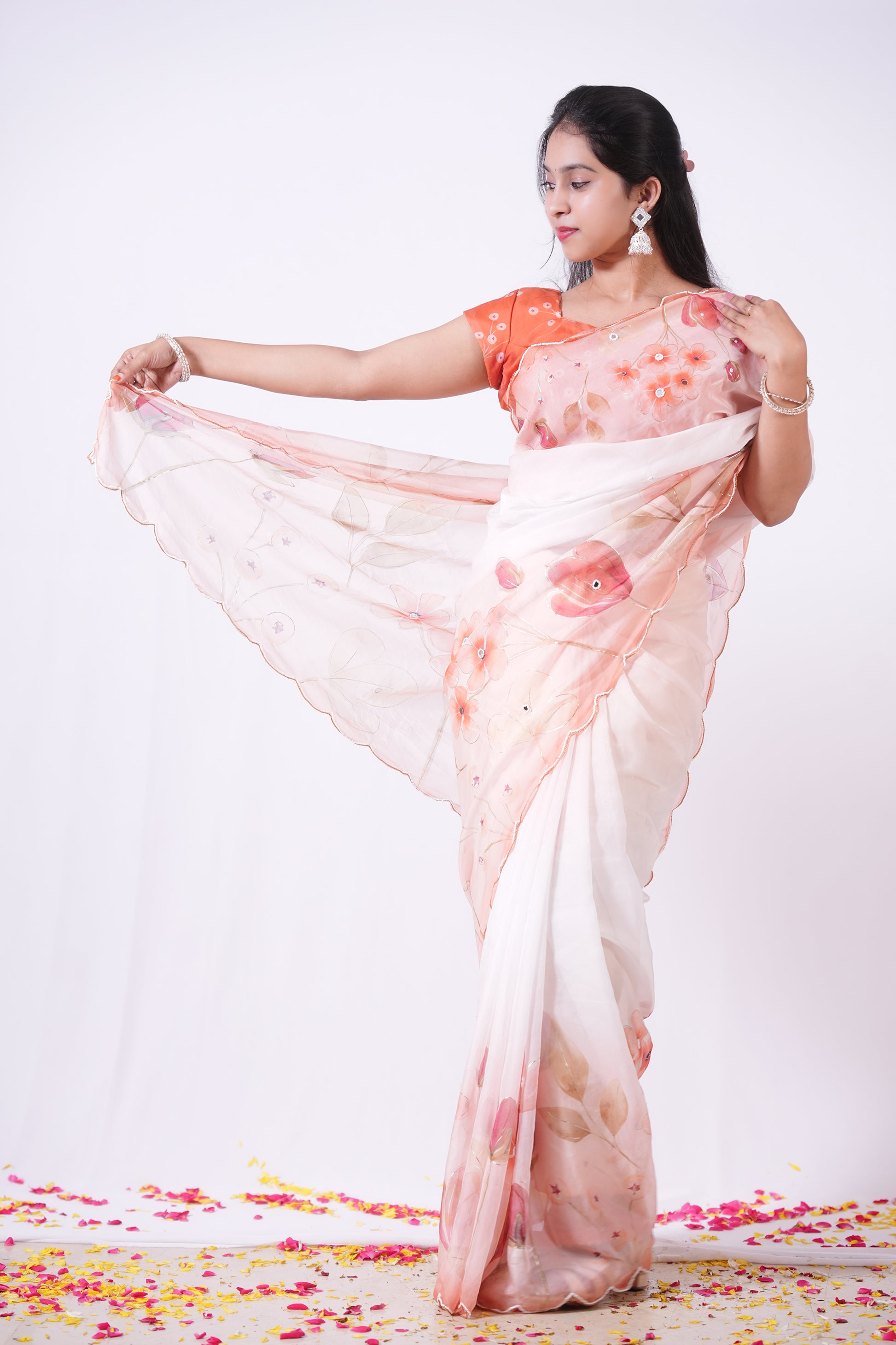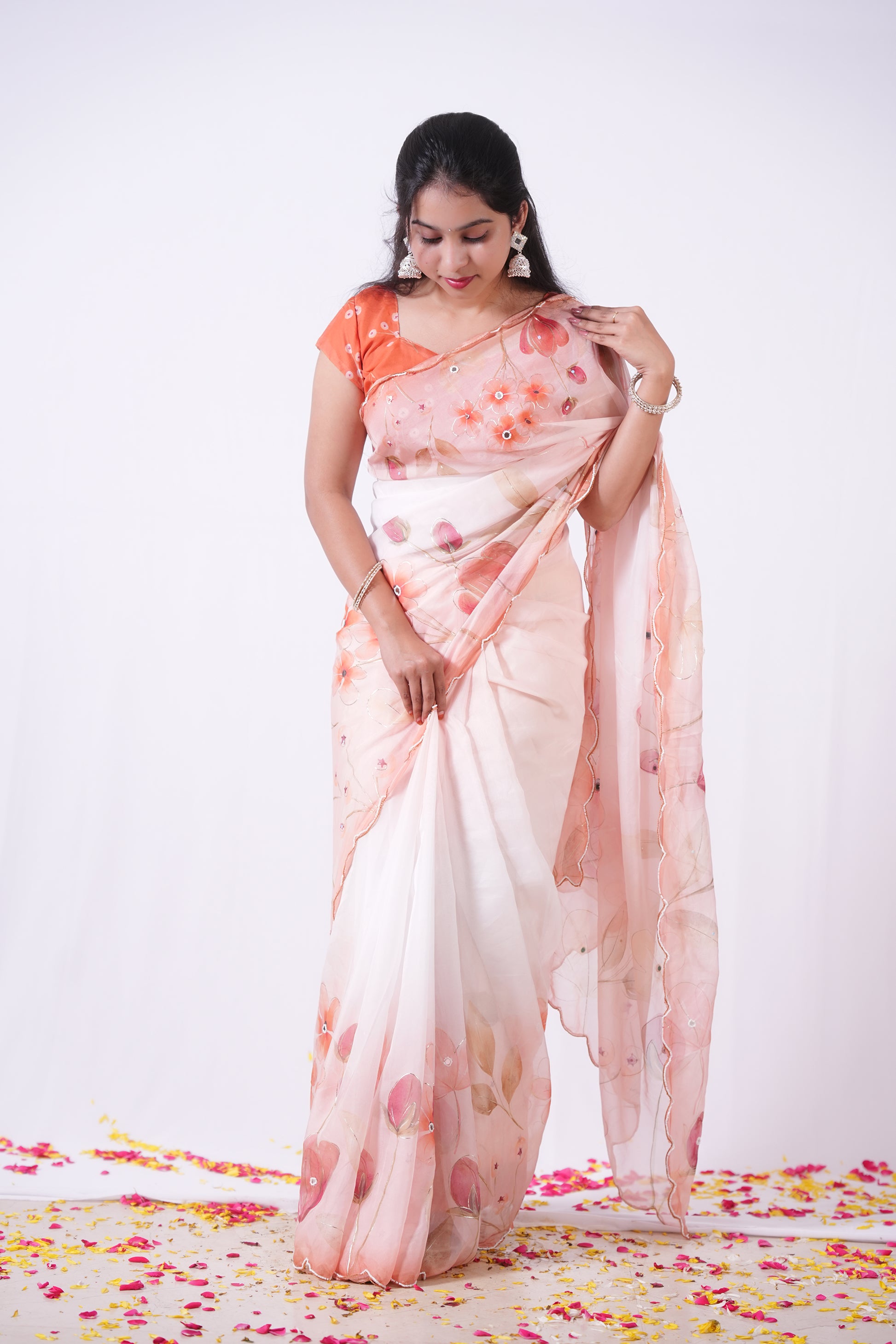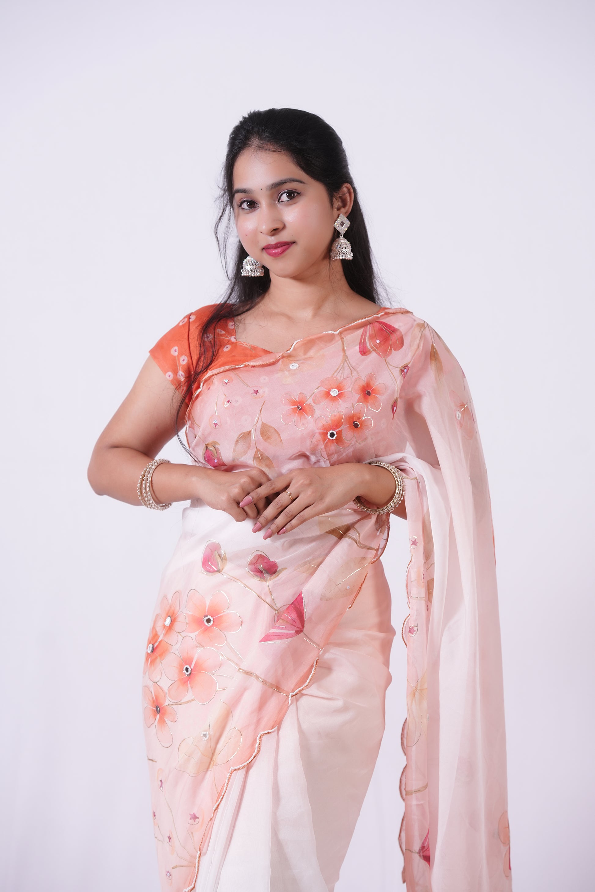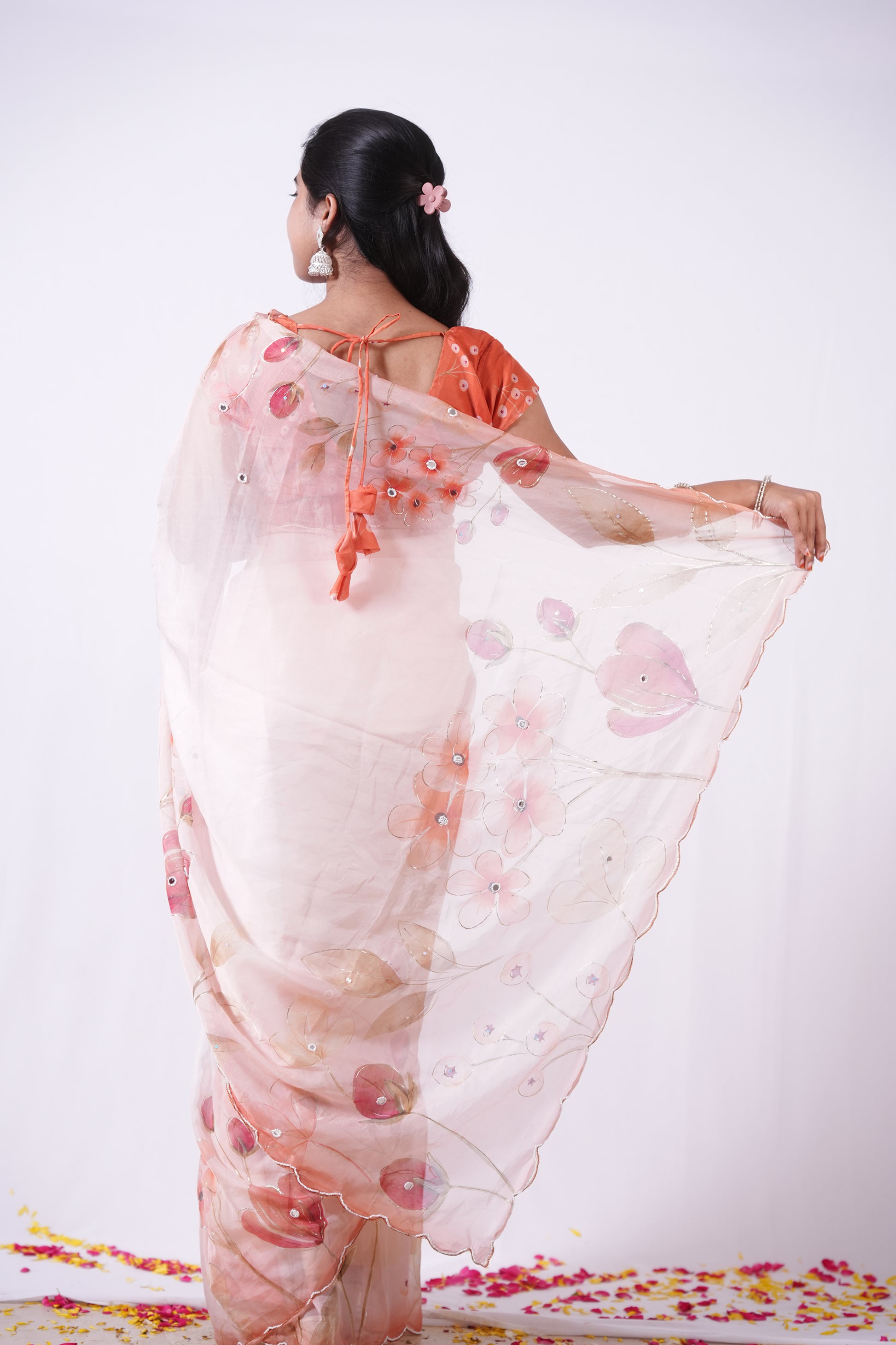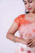 - Design: Features gorgeous, artistic floral motifs (appearing like large hibiscus or poppy flowers) across the body and pallu. The flowers are painted in vibrant yet soft hues of Orange, Peach, and Light Pink, accented by delicate gold outlines or tiny sequin/mirror-work accents in the flower centers.