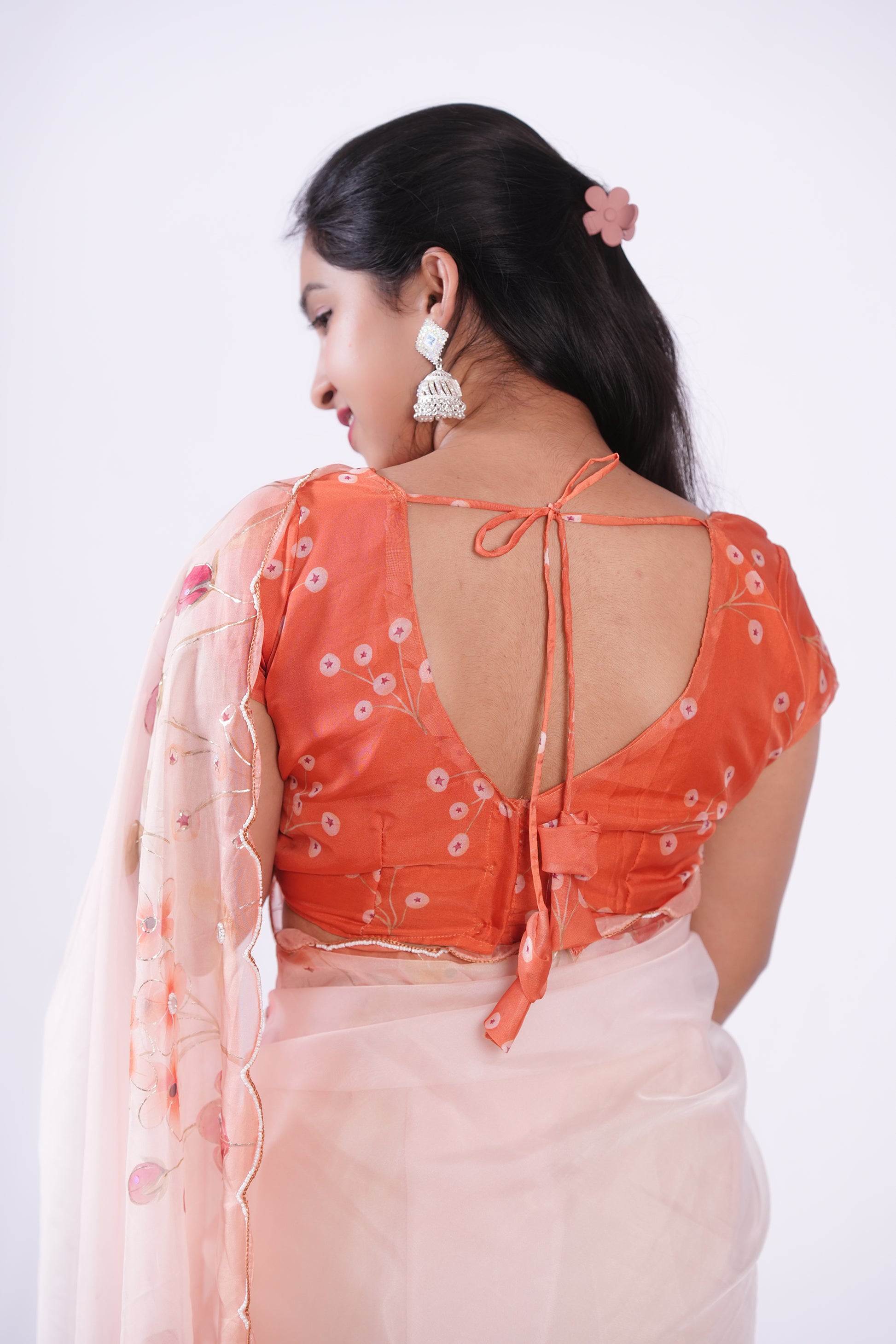 - Blouse: Contrasting Burnt Orange/Terracotta short-sleeved blouse. The blouse fabric features a subtle white Bandhani or light print/weaving pattern all over, with a deep scoop back and a traditional tasseled tie-up detail.