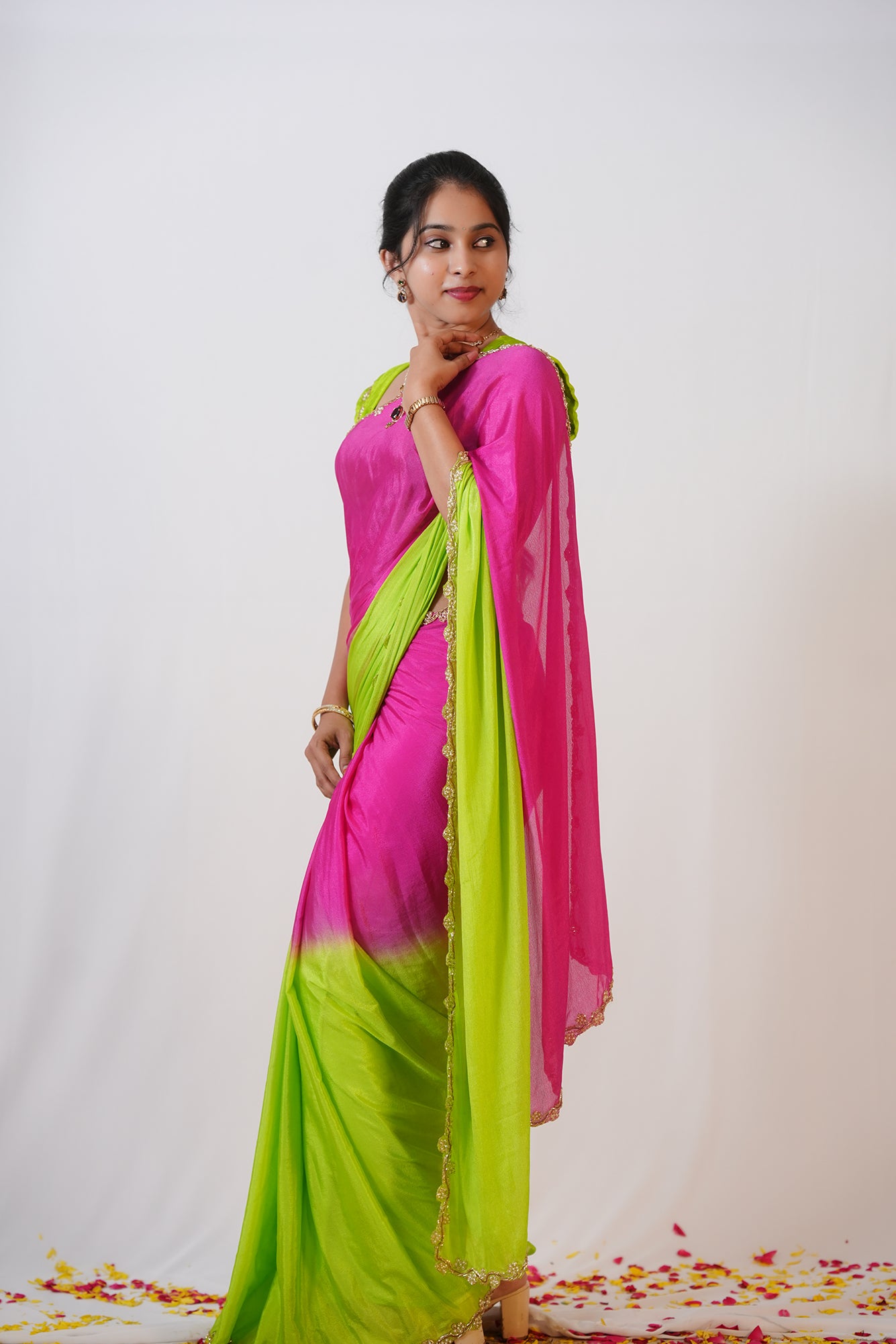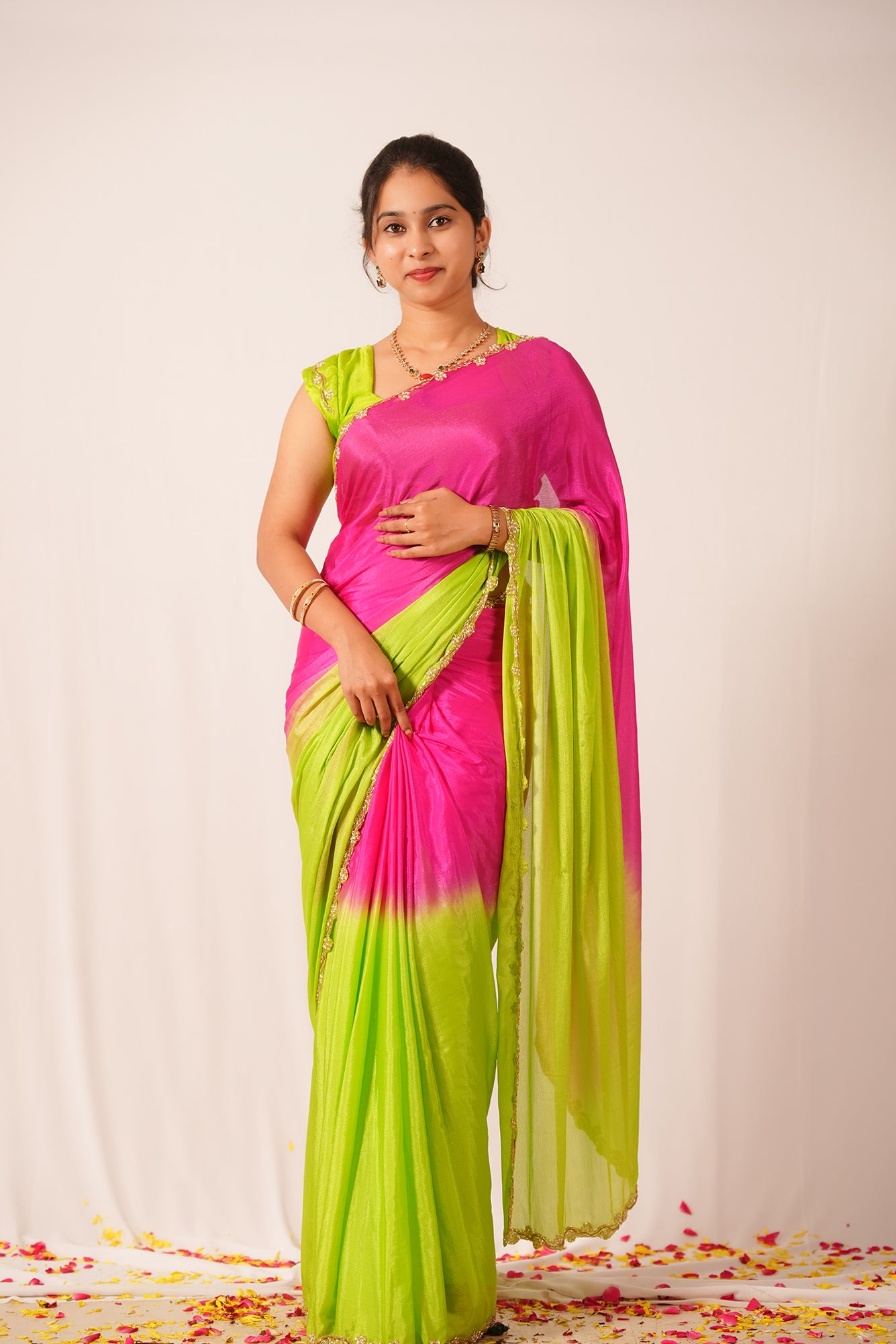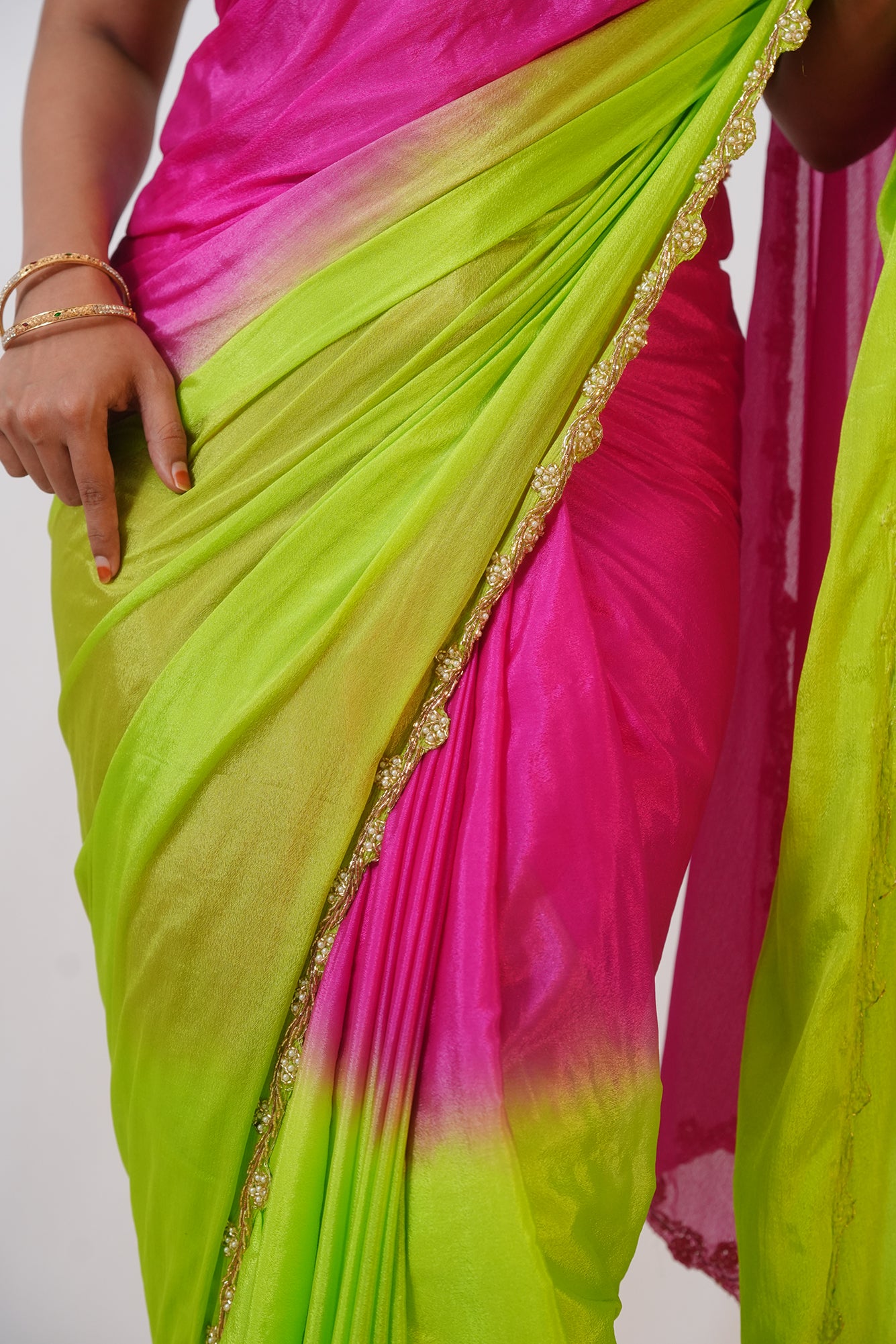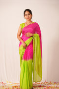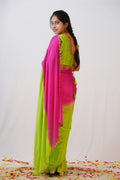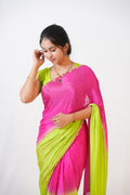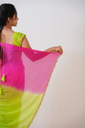 - Color: A striking dual-tone color-blocked or dip-dyed design featuring brilliant Hot/Neon Pink (Rani Pink) across the upper body and pallu, transitioning to a luminous Lime/Neon Green on the lower half.