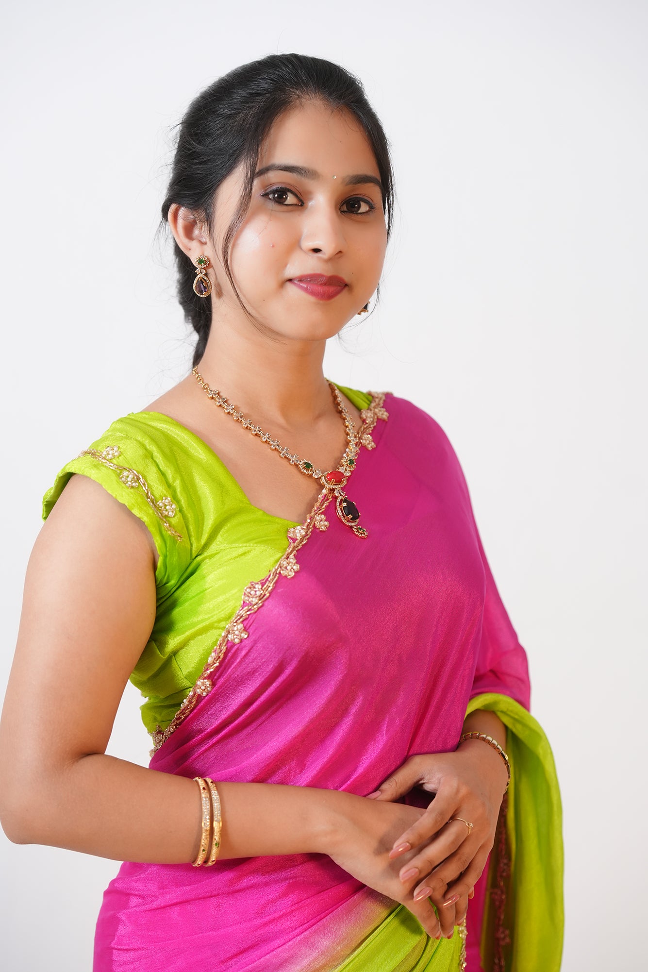 - Design: A contemporary design defined by its bold, high-contrast color split. The saree is minimally embellished to let the colors shine.