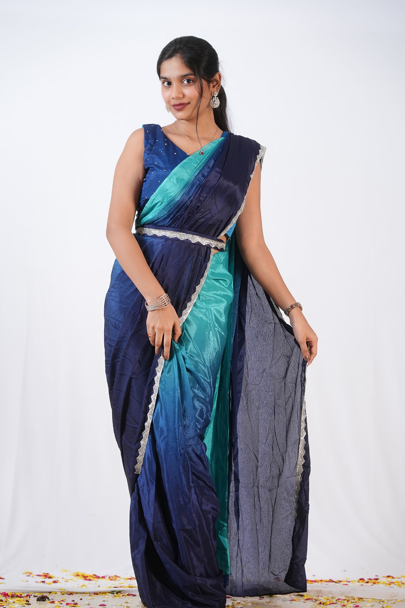 - Design: A modern take on the classic saree, featuring pre-stitched pleats for ease and speed. The color transition is the main design feature. It is styled with a contemporary silver or rhinestone belt/waistband to cinch the waist.