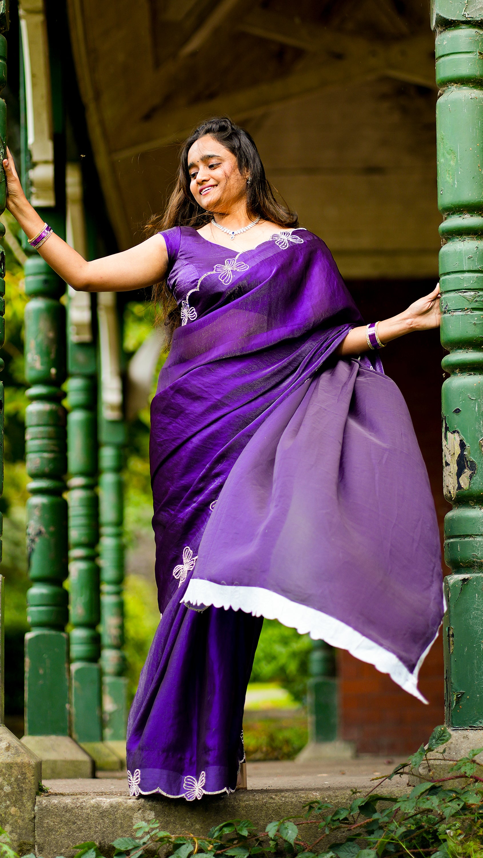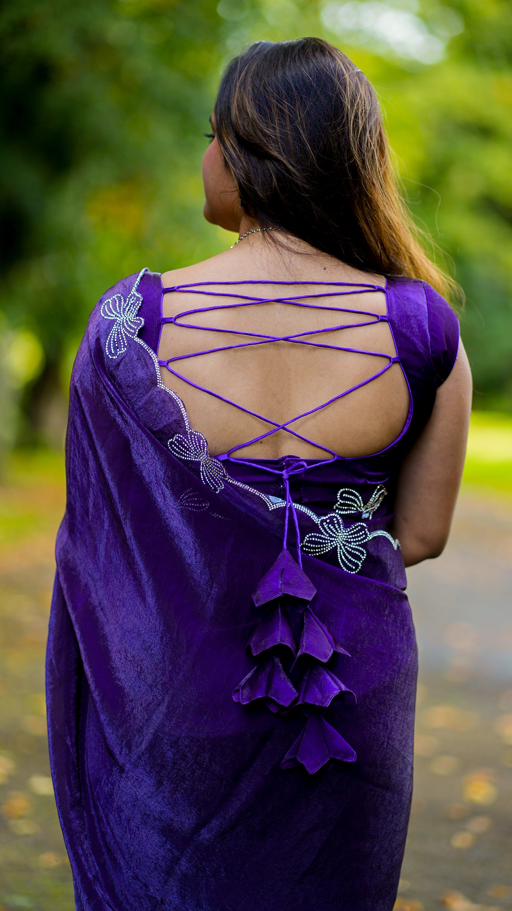 Blouse: A stylish deep-purple blouse with a statement crisscross lace-up back design finished with elegant tassels. The butterfly motif from the saree is mirrored on the blouse, creating a cohesive and chic look.