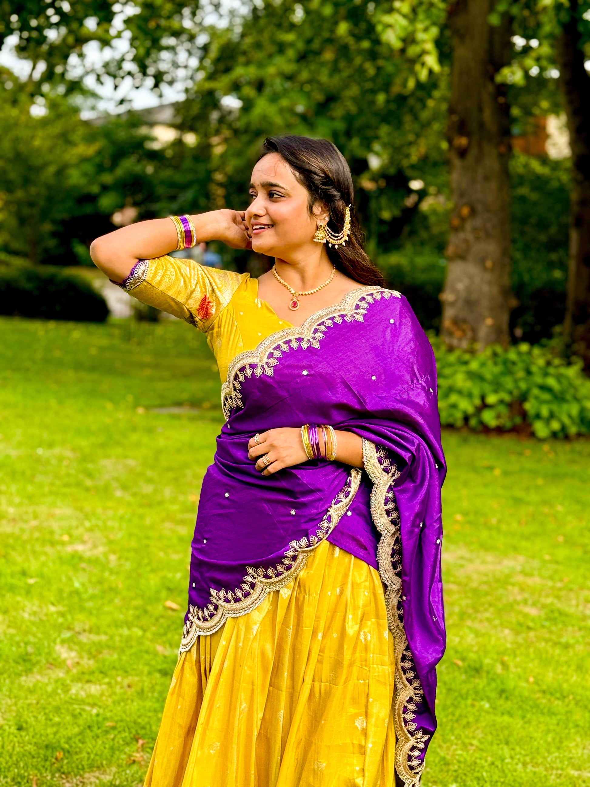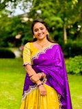 - Color: A striking contrast of Vibrant Turmeric Yellow for the skirt and blouse and a deep, rich Royal Purple for the dupatta.