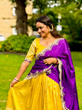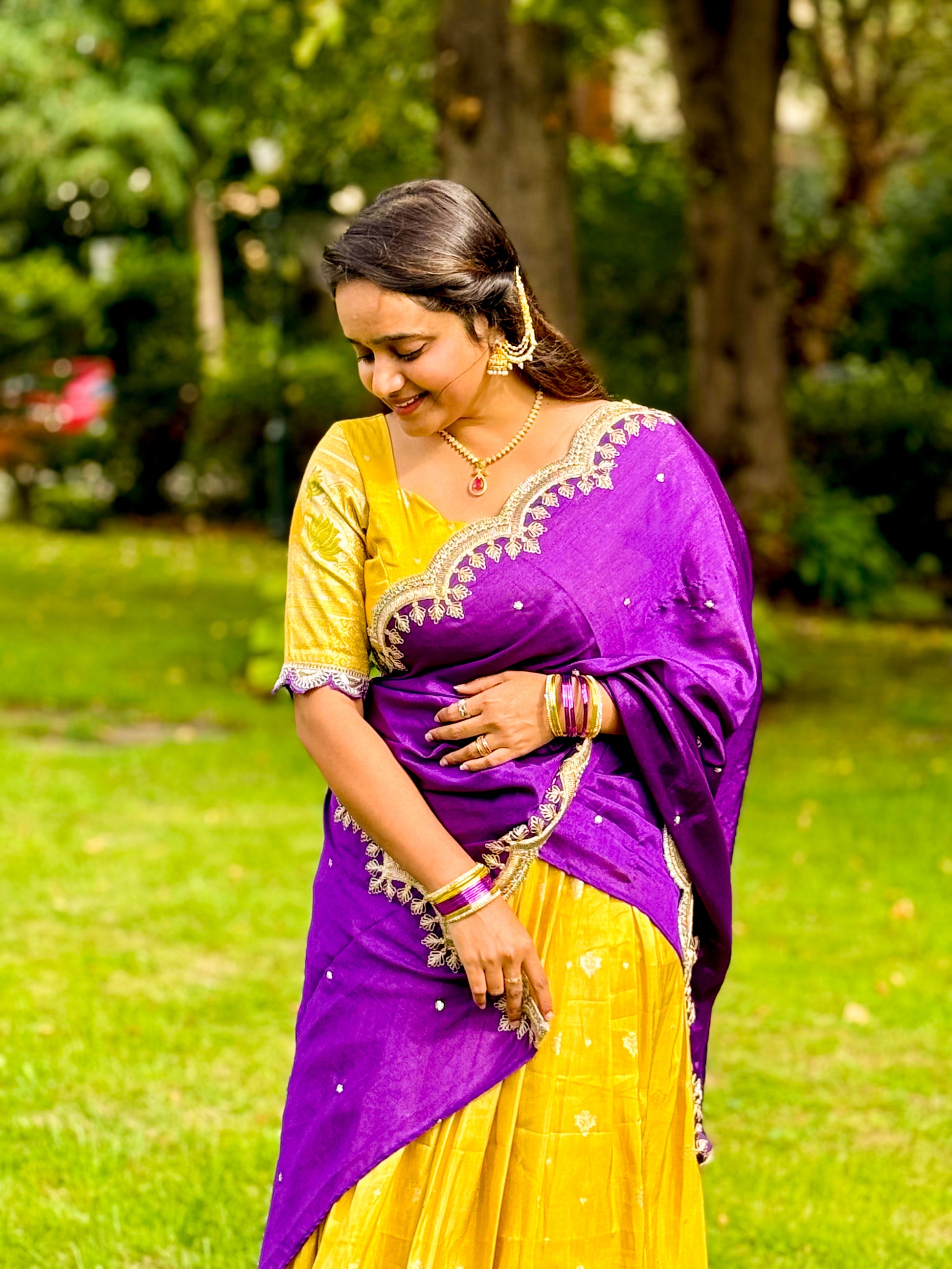 - Design: This is a Traditional Half Saree or Lehenga Saree set. The yellow lehenga features subtle self-design and traditional gold woven motifs near the hem. The purple dupatta/palla is heavily embellished with scattered gold sequin or thread motifs.
